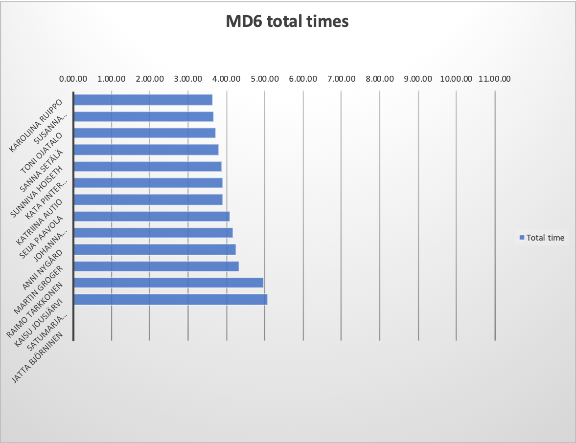 | 6 | Matti Salmi (*) | FIN | 5:31:26,0 | 10 | 14,3 | 2:00:44,0 | 3:01:25,0 | 10 | 15,2 | 2:03:22,0 | 5:25:44,0 | 10 | 14,7 | 18:05:41,0 | 11,33 | 2:07:02,0 | 4:04:06,0 | 3 | |||||||||||